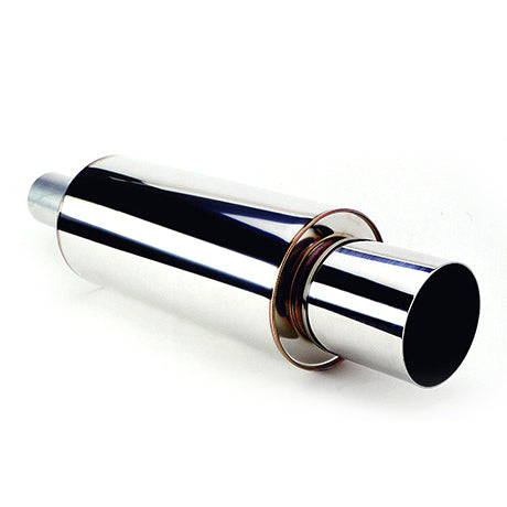 The stainless universal HKS Hi-Power muffler assemblies are the same high-quality units used in the HKS bolt-on exhaust systems. The 170mm and 130mm Hi-Power muffler shell designs are available in 75mm and 60mm (respectively) piping diameters for use with custom exhaust applications.
