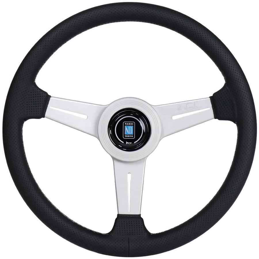This Nardi Classic steering wheel has a black perforated leather hand grip, grey stitching, matte silver anodized spokes, matching silver center ring, hardware, and classic Nardi horn button.