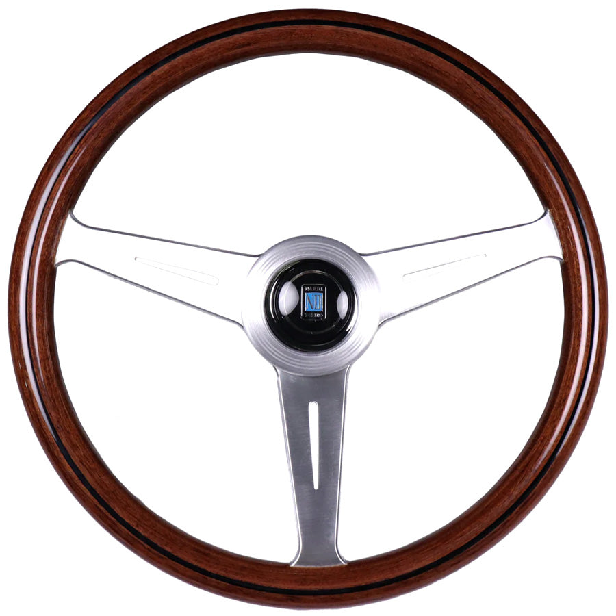 This Nardi Classic wooden steering wheel offers satin (brushed) spokes, a glossy smooth medium dark mahogany wood grain grip, and a genuine Nardi horn button w/satin horn button ring.