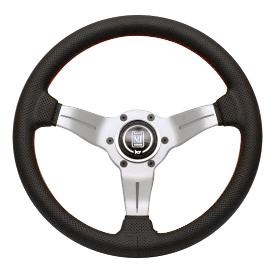 Nardi Deep Corn Steeing WHeel - 330mm | Black Perforated Leather / Silver Anodized Spokes w/ Red Stitching