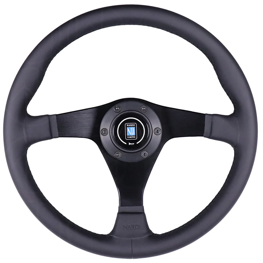 The Nardi Gara 3/0 steering wheel features black leather hand grips, black stitching, anodized black spokes, matching black center ring, Nardi imprint on bottom spoke, Nardi horn button, and countersink Allen screws (6pc).