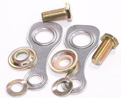 The 01324 Kit is a set of bolt in brackets that are usually sewn into 2" Lap belts. We call it a "Rallye End" kit because it usually comes on the street legal Rallye style belts. Like the 01323 kit, it is designed to be bent. These pieces are commonly used in Porsche applications where space for an Eye bolt is insufficient. This bracket can be bolted to the car, then bent so that a Snap-In bracket can be used to fix the harness to the bracket. We use these brackets in many applications where stock mounting locations do not leave sufficient space, or if the thread pitch is different from the eye bolts.