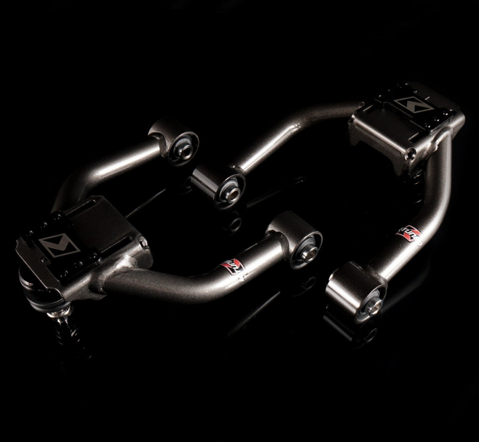 Front camber kit makes it easy to adjust camber and proper setup and align your car whether that is for street driving or racing. Available in both hardened rubber or spherical bushings.