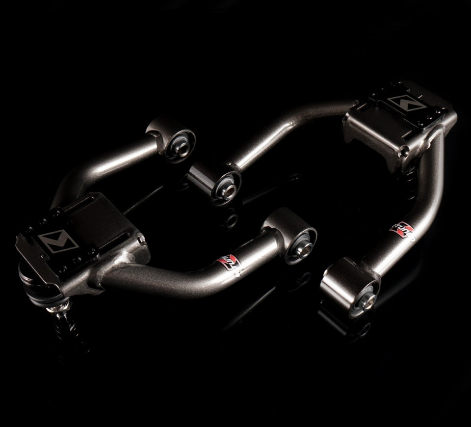 * Please note our K-Tuned Upper Camber Arms are designed for lowered cars only. DO NOT use them to correct camber angles on race cars that are raised higher than stock.The max drop we have tested is 3" lower than stock. If used on a setup lower than 3" or a setup higher than stock, the balljoint could contact the edges of the cup it sits in, and damage could occur.