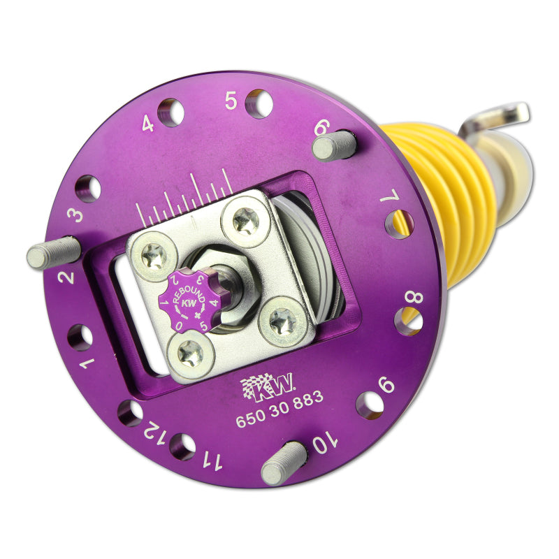 Similar to the KW Competition suspension used in international motorsports, the KW 3-Way Clubsport coilover kit allows fine tuning of the compression damping separately in the low-speed and high-speed range. The click adjustments of the TVCLH-A valve technology make for easy adjustment directly on the reservoir. You can modify the low-speed compression damping with 6 precise clicks with the purple low speed adjustment dial and directly beneath it the golden adjustment wheel provides an additional 14 precise clicks of high speed compression adjustment. In addition, the TVR-A technology provides 16 clicks to noticeably adjust the rebound damping independently of the compression damping. If you would like to adjust the KW 3-Way Clubsport coilover kit it can easily be adjusted for more comfort or to an alternative setup for a new race track. The KW 3-Way Clubsport benefits from the same motorsports technology that has proven its endurance with multiple overall wins at the ADAC Zurich 24h Nurburgring race.