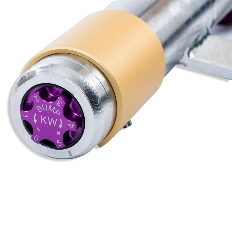 Cutting-edge motorsports technology for more performance on the road. Like every suspension product developed by KW automotive, the suspension manufacturer, and manufactured in Germany, the KW V3 Coilover suspension kit also provides a significant plus in safety reserves in road traffic. Thanks to the chassis with its high-quality dampers, springs, and elastomer spring elements, pitching and rolling movements during load changes such as evasive maneuvers, cornering, acceleration, and braking are significantly reduced. The braking distances are also shortened. Thanks to improved support and feedback, drivers not only feel safer but driving in everyday life becomes even safer. With compression and rebound stage damping, that can be set separately and independently of each other, the damper setup can be customized to your personal driving preferences or vehicle changes such as weight, tire characteristics, or altered vehicle rigidity. True performance optimization is only possible with this unique, patented system. For example, this allows the compression damping force to be increased and get more grip from the tires, to improve cornering behavior and reduce squat without simultaneously altering the rebound stage damping which is optimally matched to the spring rate, a scenario which results in reduced grip and the associated loss of performance. The KW V3 coilover kit is the ideal tool for performance-oriented drivers and experienced tuning enthusiasts who place a strong emphasis on the overall performance of their suspension. The Variant 3 features patented TVR-A and TVC-A technology that provides separately adjustable rebound and compression damping. The extensive adjustment range of the independently configurable rebound and compression make it easy to directly influence the steering behavior, directional stability, grip and handling characteristics for confident and repeatable results at the limit of driving dynamics.
